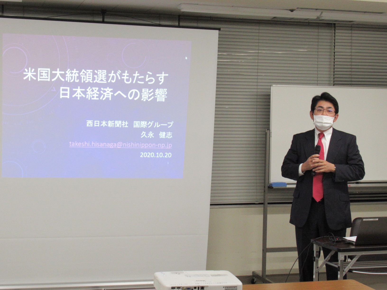 「米国大統領選がもたらす日本経済への影響」というテーマで例会開催。講師は西日本新聞国際グループ 久永健志部長。大統領選結果を複数のシナリオにより予想の後、トランプ・バイデン両候補の政策や考えの類似点と相違点を解説。その上で、それぞれの候補が勝利した場合の日本経済への影響を予測された。卓話会終了後は「為替への影響」「戦争の可能性」などさまざまな質疑がなされた。