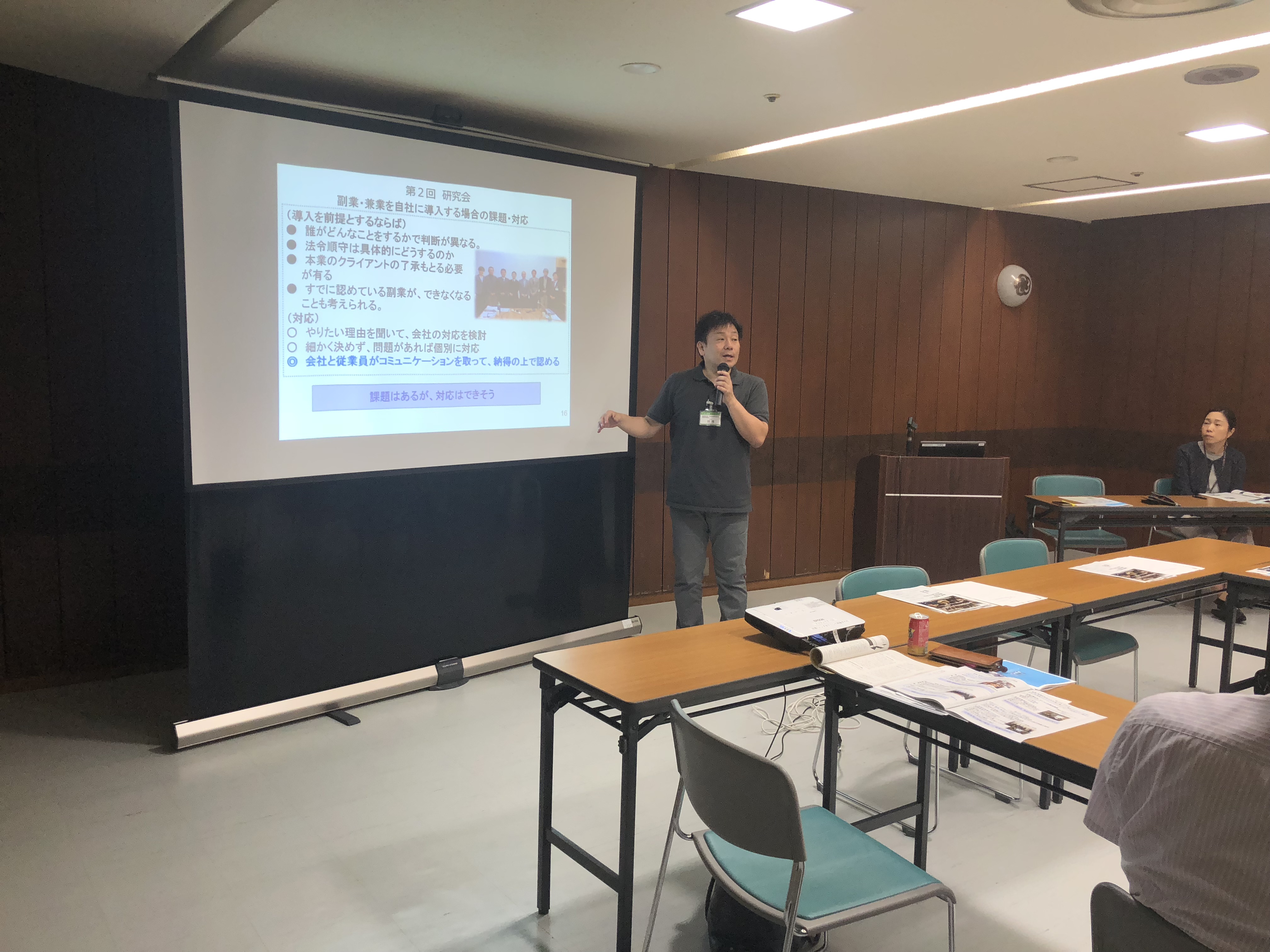 講演の後半では、田原様を交えて会員同士、副業・兼業についての率直な意見交換を行い、制度自体に曖昧模糊な部分が多い現状で、経営者側が抱えるリスクや労働問題を前に、副業・兼業をどのようにしたら導入できるのか、または、導入すべきでないのかということを忌憚のない言葉で意見交換することができました。