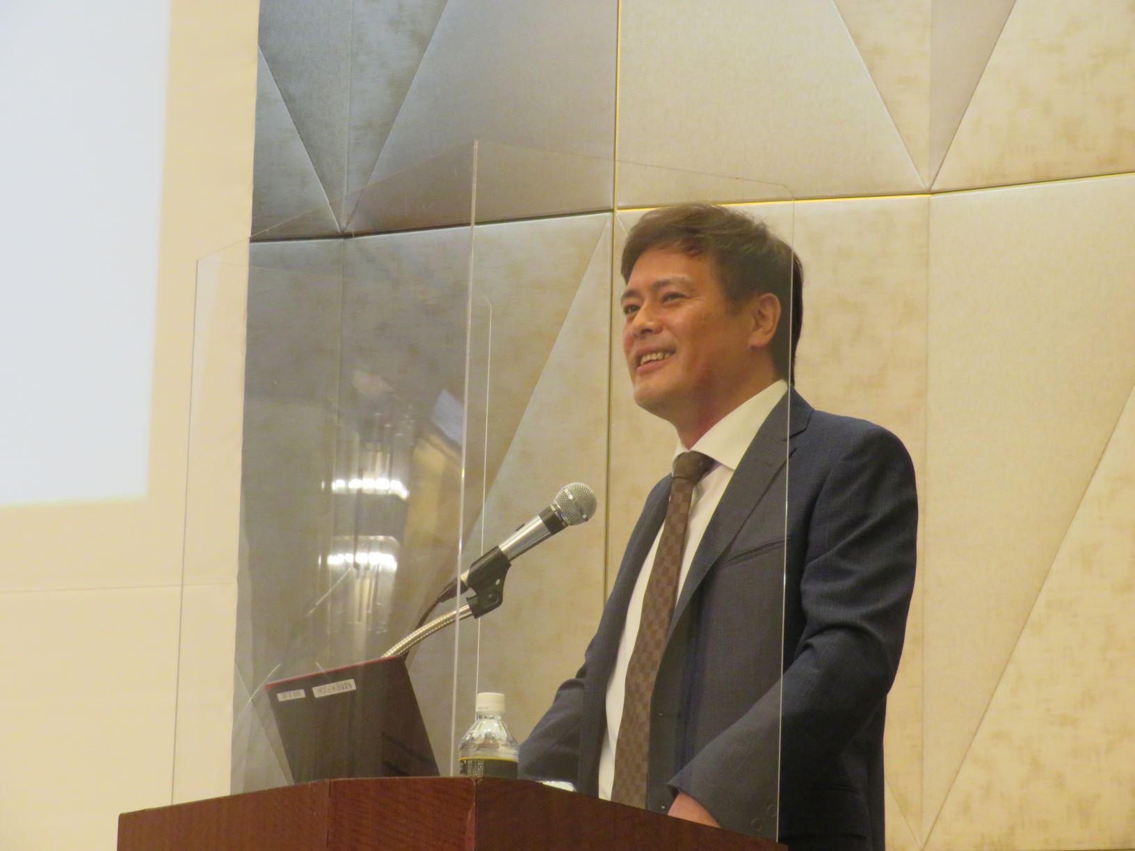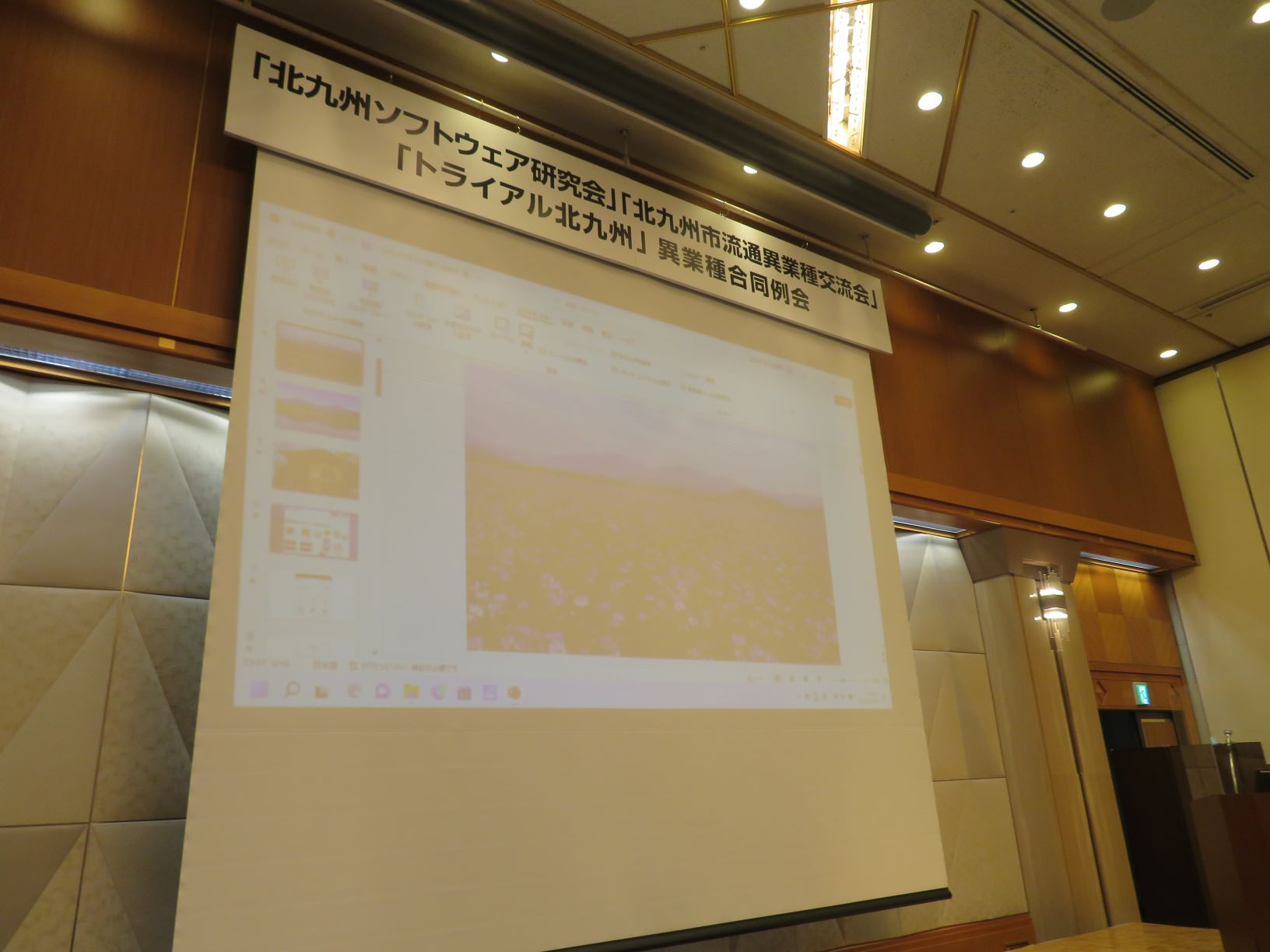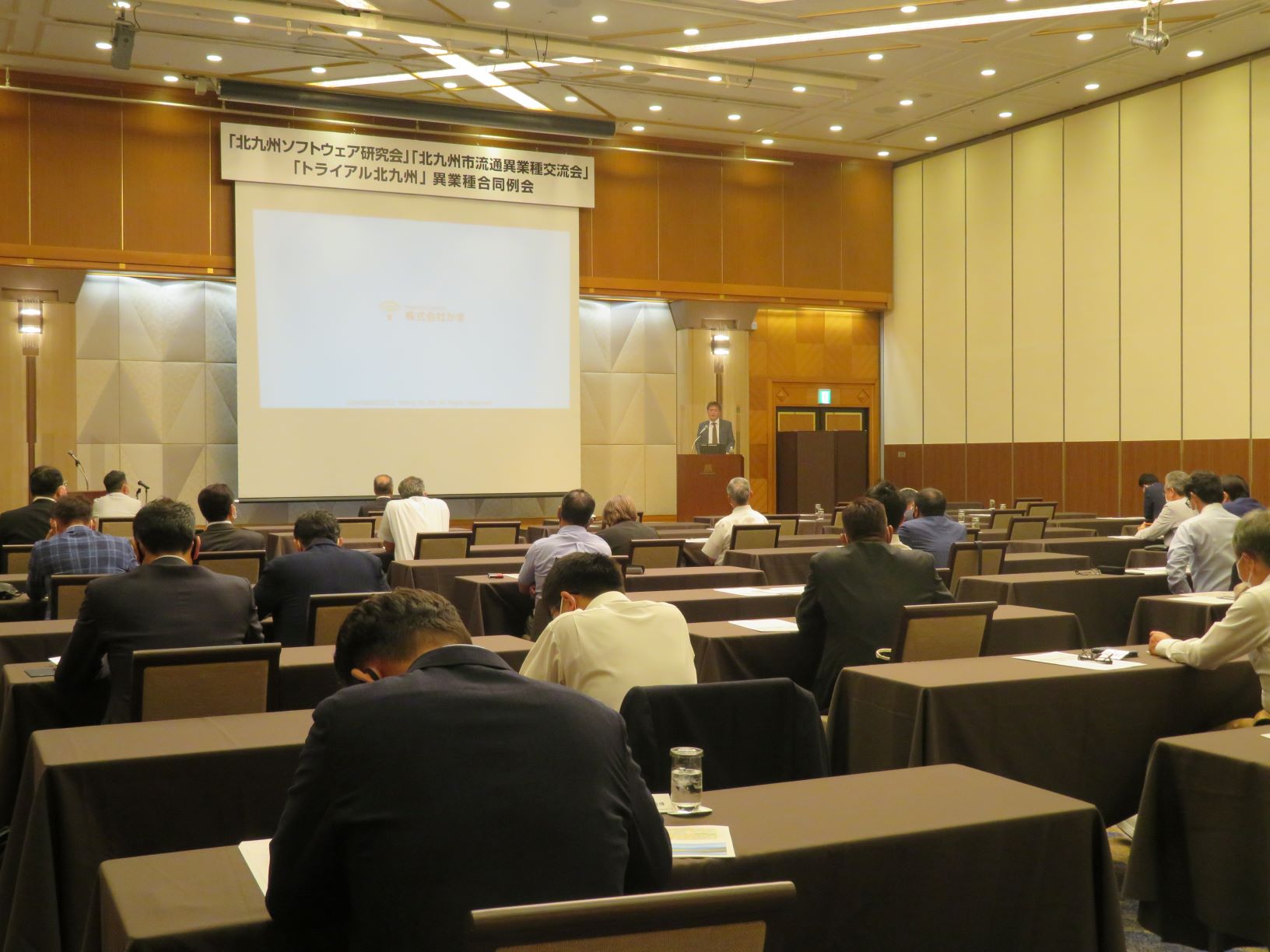「北九州市流通異業種交流会」「北九州ソフトウエア研究会」との合同例会をリーガロイヤルホテル小倉にて、3年ぶりに開催した。講演会では嘉麻市に本社をおく(株)かま 代表取締役社長 有田栄公氏をお招きし「最先端の田舎を目指して 地方中小企業の挑戦」と題し講演いただいた。地域消費を促す地元アプリの開発や発電所設置計画など、画期的な地域振興策が紹介された。その後、感染対策を講じたうえで、着席型の懇親会を開催し、各団体の会員同士で交流を深めた。