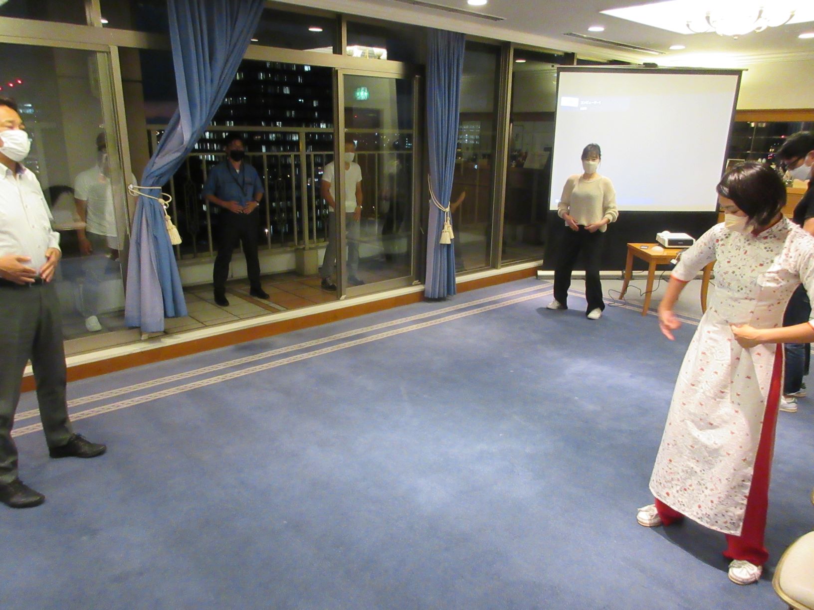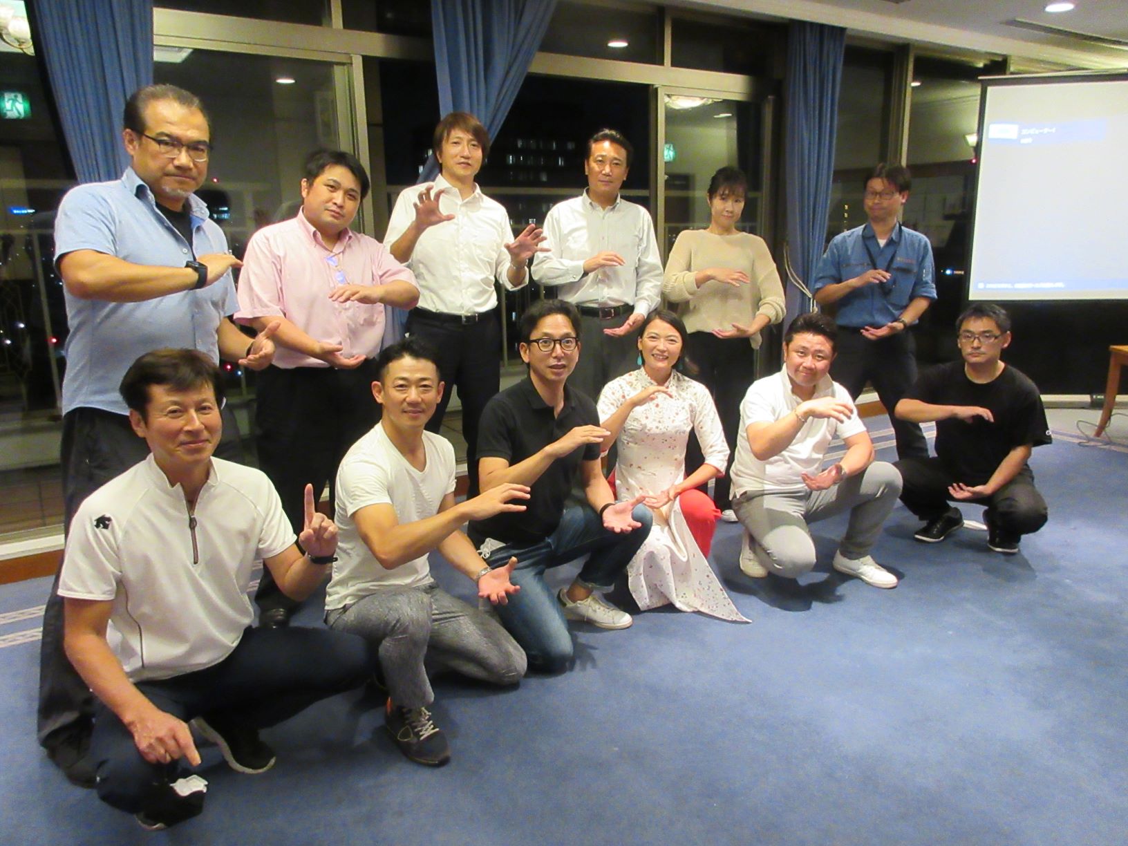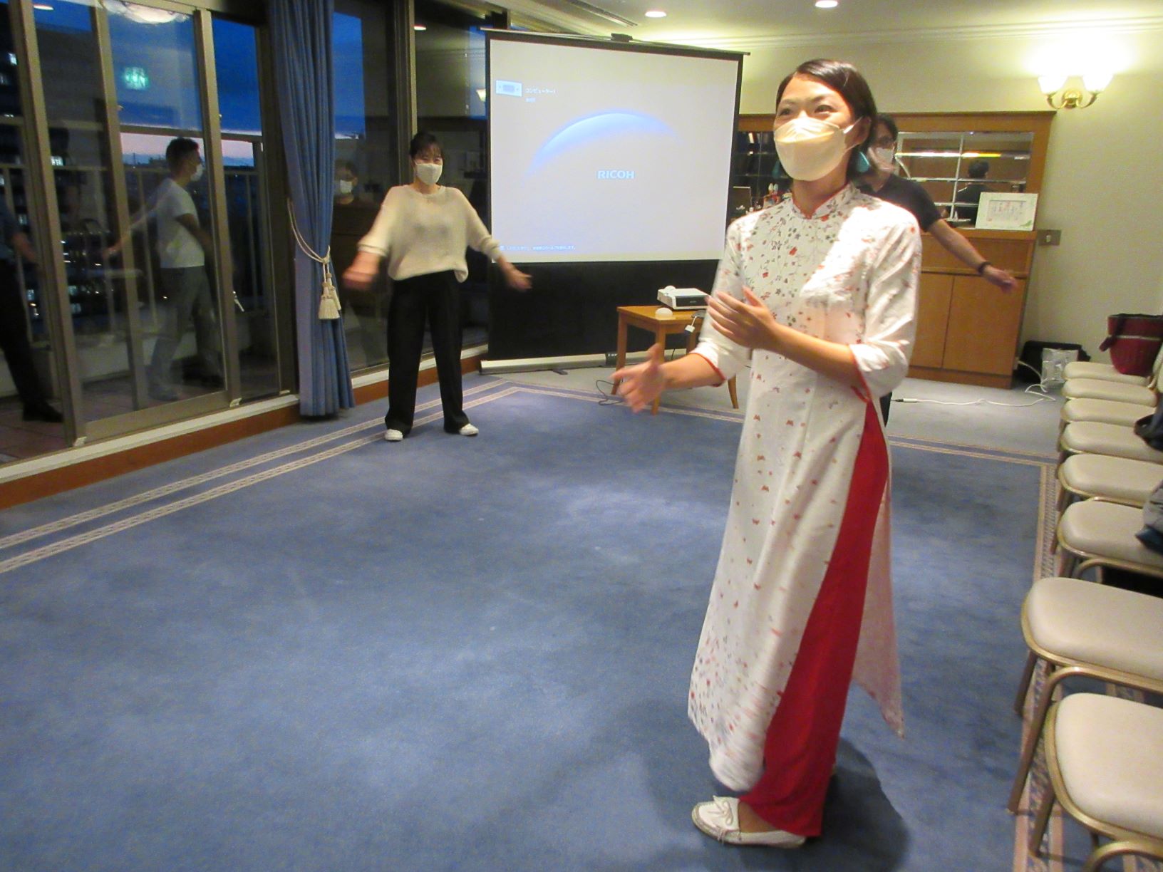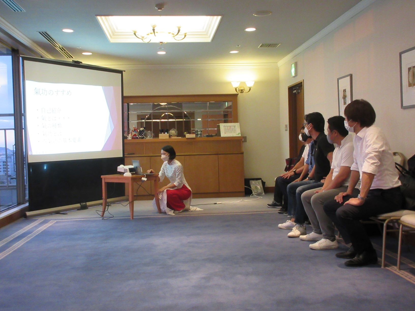 コロナ第7波も収束してきた為、2カ月ぶりに例会を開催することができました。今回は美健氣功インストラクターの吉村知佳氏を招いての氣功体験です。どうせならば自然の中で行いたいと思い、勝山公園での野外開催を企画していましたが、最終的には雨天の可能性を鑑み、勝山公園を目の前に望むホテルの一室での開催となりました。当日はベランダまで広く使用し、解放感のある中で11名が氣功を体験。夕暮れがとてもきれいで、皆さん思わず写真を撮ったほどです。環境的にも気分転換になりましたし、それぞれのお仕事上でもご苦労のある中で、気分転換などにこの知識を使いたいという声をいただきました。