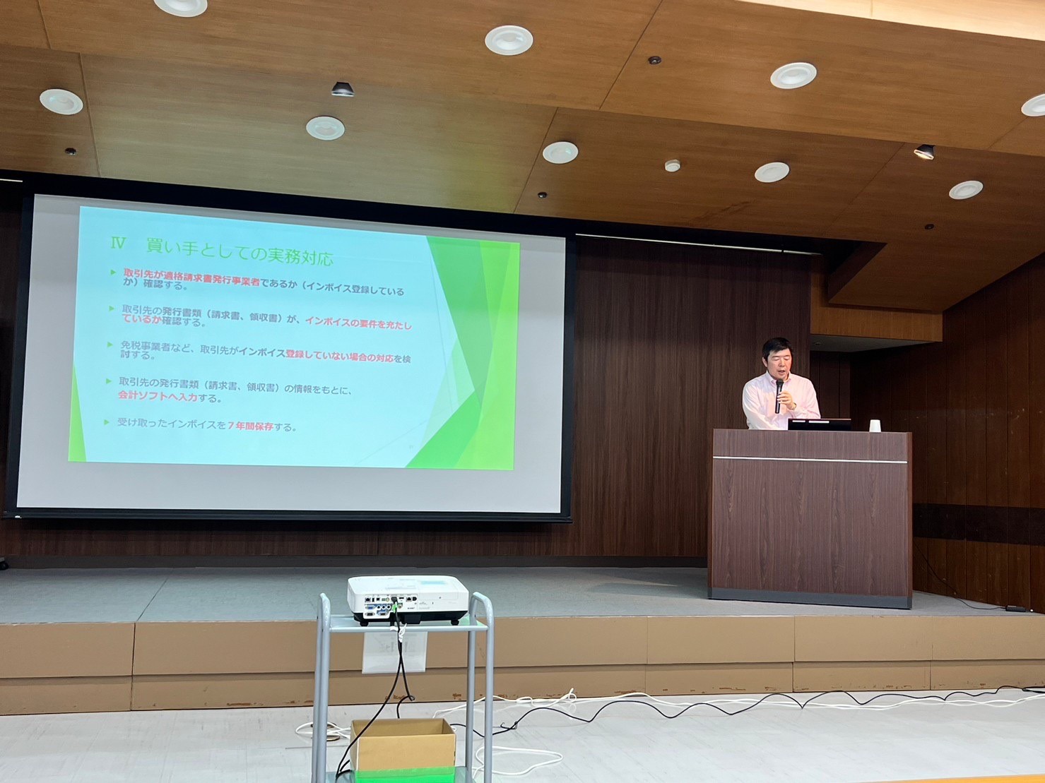 色々な角度から見たインボイス制度の説明をしていただき、講演後の質疑応答も多数あがり、参加者の興味の多さがうかがえる研修内容であり、有意義な時間となりました。