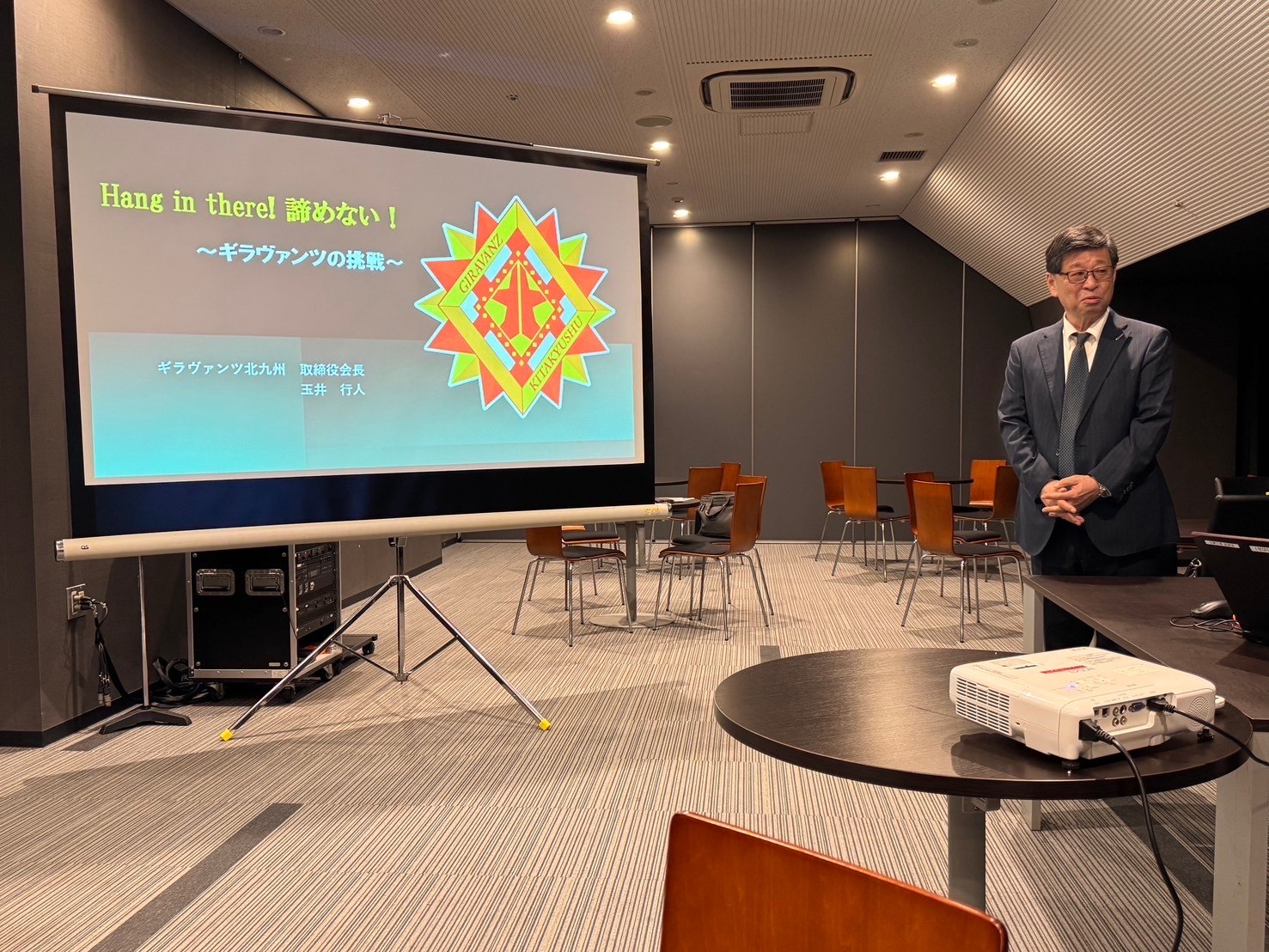 後半は、サッカーJ3ギラヴァンツ北九州の玉井行人会長をお招きして、「Hang in there!諦めない!~ギラヴァンツの挑戦~」と題してご講演いただきました。ギラヴァンツの歴史や今後のチーム展望だけではなく、伯父に火野葦平氏や従兄に中村哲氏という玉井会長の経歴や背景を踏まえた北九州の歴史など貴重なお話を聴くことができました。