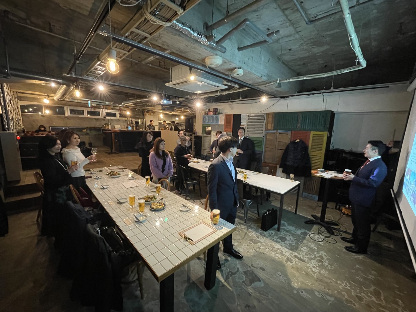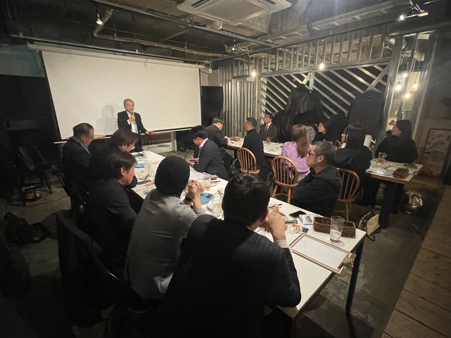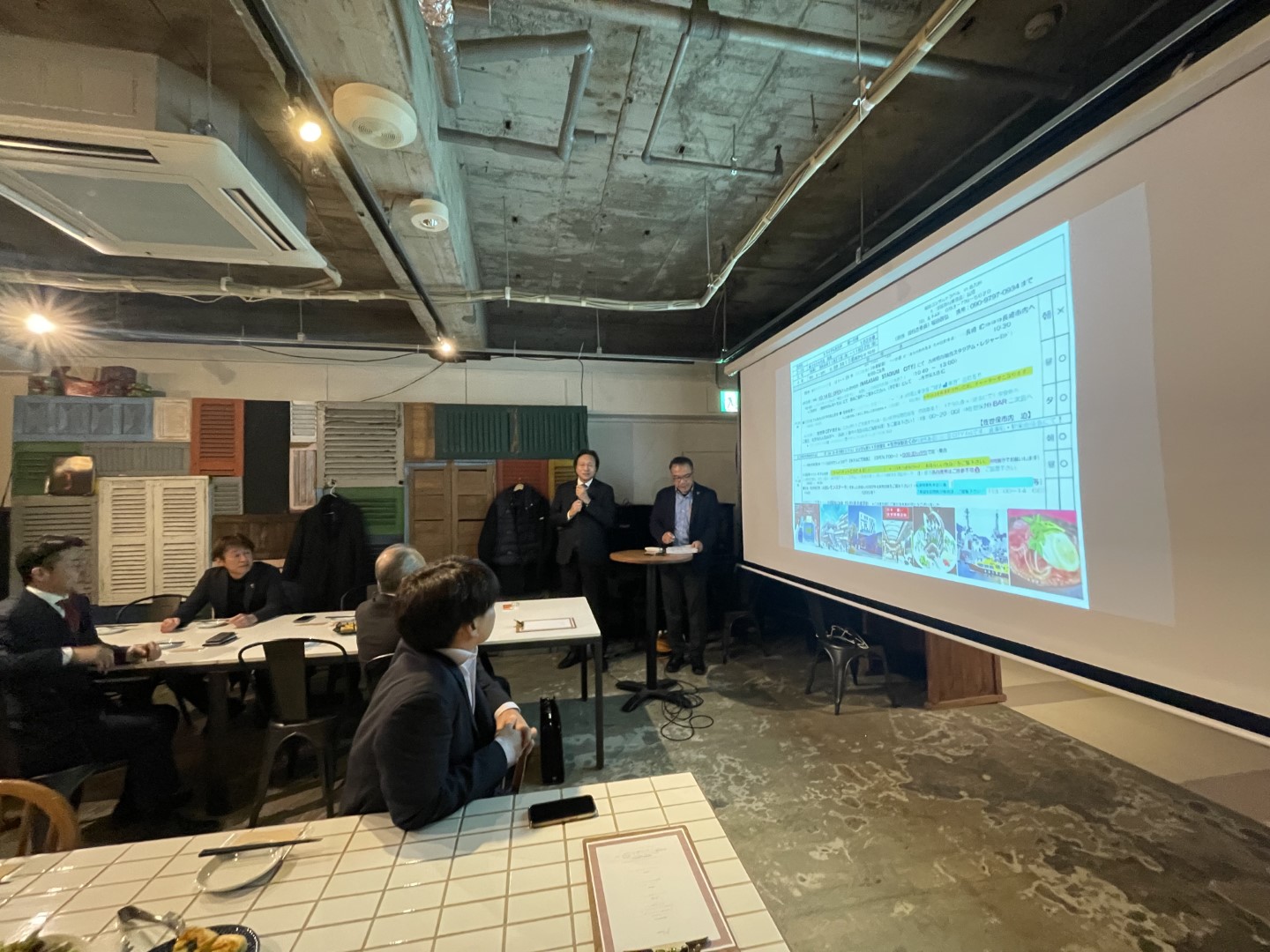今回の12月例会は、毎年恒例の忘年例会としてTangaTableさんにて開催いたしました。波多野会長のご挨拶に始まり、福田さんと小原さんのコンビによる11月の長崎視察旅行の報告を、面白おかしくも真面目に発表していただきました。その後、参加者全員から2024年の総括と2025年の抱負の発表があり、新メンバーが多い中、お互いのことを知る良い時間となりました。最後は、盛り上がりの中、江藤監査が中締めの挨拶を行い、終了いたしました。学ぶべき時間と親睦を深める時間のメリハリがついた、とても良い忘年例会となりました。
