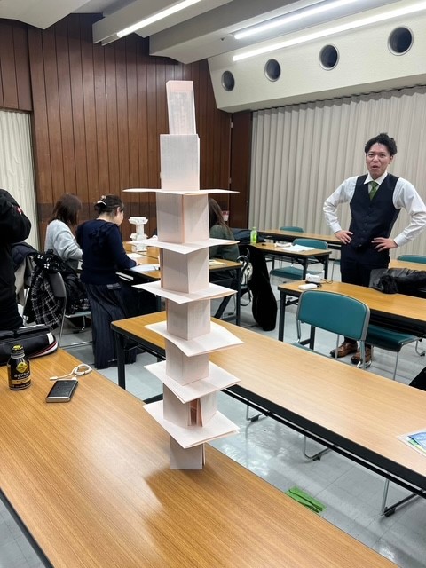 プレゼンの間に「A4の紙をどこまで高くできるのか?」を3つのグループに分かれシンキングタイム後、道具を使わずに高くしていく各グループでタイム内に積み上げ、優勝は波多野会長のグループが優勝しました。